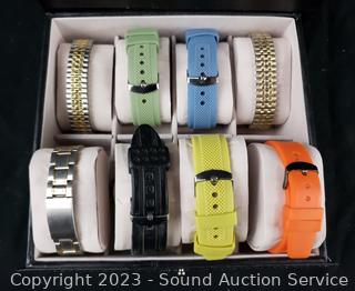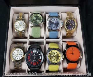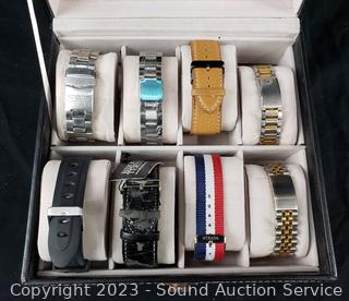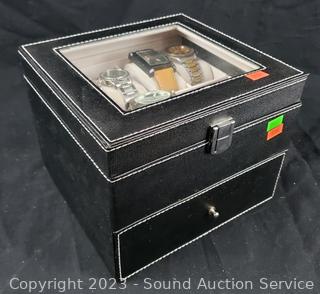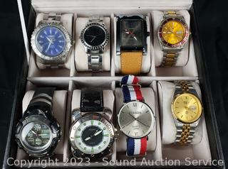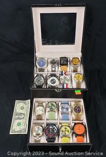Lot Details: Untested, believe all but the Invicta need new batteries. Nice Invicta Automatic Professional Divers Watch 200m, in great condition, holographic style face, works. Other brands include Blackjack, Prestige, Botany, Strada, Terner, Geneva. Case is 6.5" H x 8.5" W x 8" D.