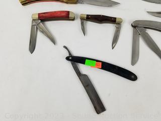 Lot Details: Several Frost Cutlery, Several Bear hunter, Geneva straight edge. Old Timer Schrade Honing Steel & others. Up to 9.5" long.