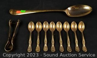 Lot Details: Tray, large spoon, 8 small tea spoons, sugar tongs, cream, sugar, 2 teapots. Don't see any major issues.