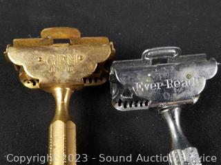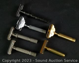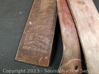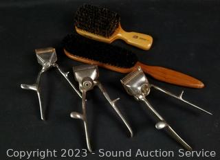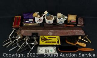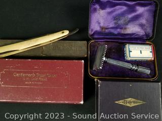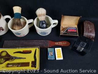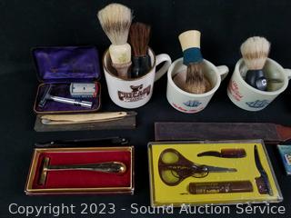 Lot Details: Assorted razors, hand clippers, shaving cream brushes, cups, straight razor, leather strops. Refer to photos for more info.