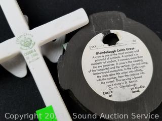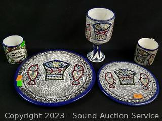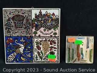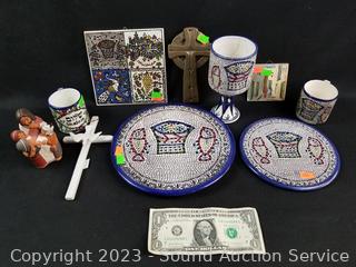 Lot #0207: Hand Painted Tiles, Cups, Figure, Crucifix