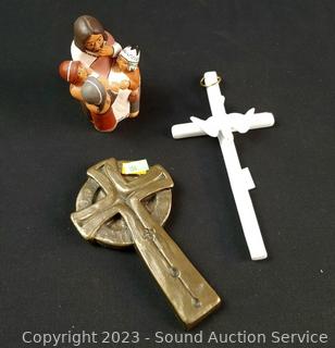 Lot Details: Lefton China & brass crucifix, goblet has been broken & repaired. Handcrafted pottery figure.