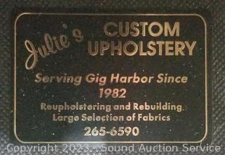 Lot Details: Custom upholstered by Julie's Upholstery. 32" H x 27" W x 18" to seat. Olde patina finish.