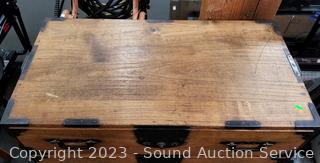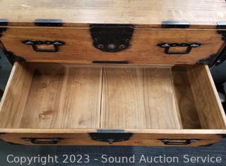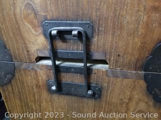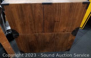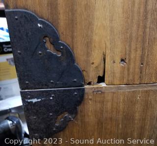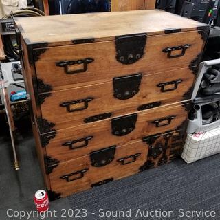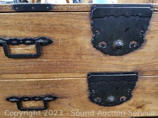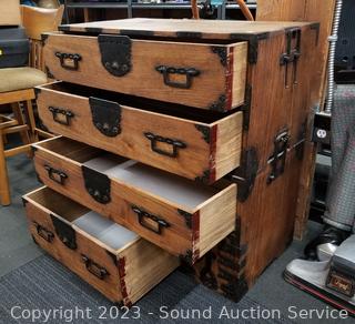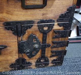 Lot Details: Believe Japanese. Wrought Iron hardware, solid wood construction. Attach to each other with iron hardware. Unique skeleton key locks, no key, Also has lower cabinet, locked closed. Overall 35.5" H x 34.25" W x 17.5" D.