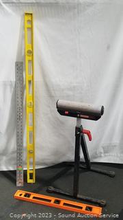 Lot Details: 24" to 48" levels, 36" straight edge, Craftsman roller stand 28" to 45" tall, 12" wide.