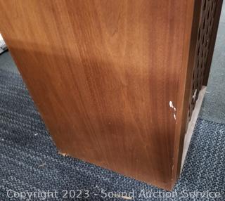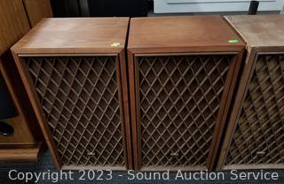 Lot Details: One speaker has very low input, all have cosmetic damage. 25" H x 14" W x 11.5" D.