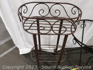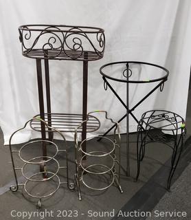 Lot Details: 2 Pie tower racks, 18" H x 11" Dia. 2-tier plant stand rack 32" H x 18" x 9". Folding table, no top, 24" H x 16" Dia. Small plant stand 15" H x 10" Dia.