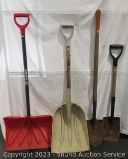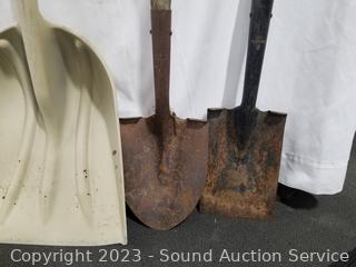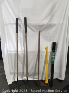 Lot Details: 36" x 25ft 3/4" garden netting, snow shovel, hoe, cultivator, spade shovel, weed puller, splitting axe.