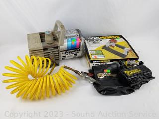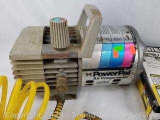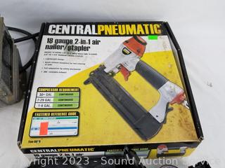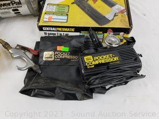 Lot Details: Power Pal Air Compressor, Central Pneumatic 18GA Air Nailer/Stapler 5/8" to 2" brad nails, 5/8" to 1-5/8" narrow crown staples. 12V pocket Compressor. All functioning as intended.