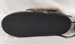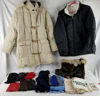 Lot Details: Seal skin boots made in Alaska, 10.5" long soles, don't see a size. Zero Xposur cold weather reversible jacket S:S, Orvis cold weather jacket S:12, winter gloves & scarves.