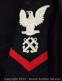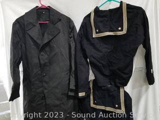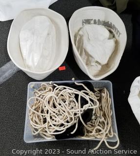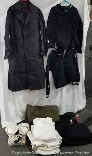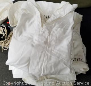 Lot Details: 2 duffels, 4 pairs of white slacks S:33M, 4 white shirts S:S, 3 pairs of blue slacks S:31, 3 blue shirts S:S, blue sweater S:38, jacket S:40, 2 hats. Refer to photos for condition & more info.