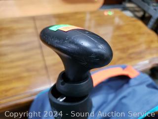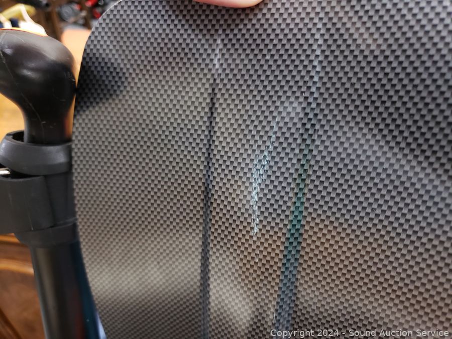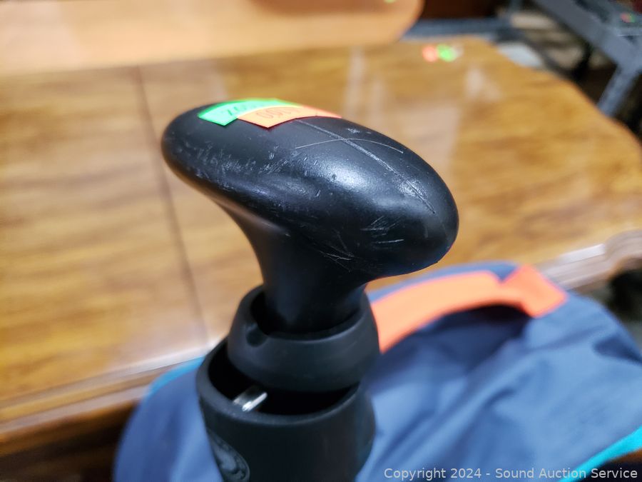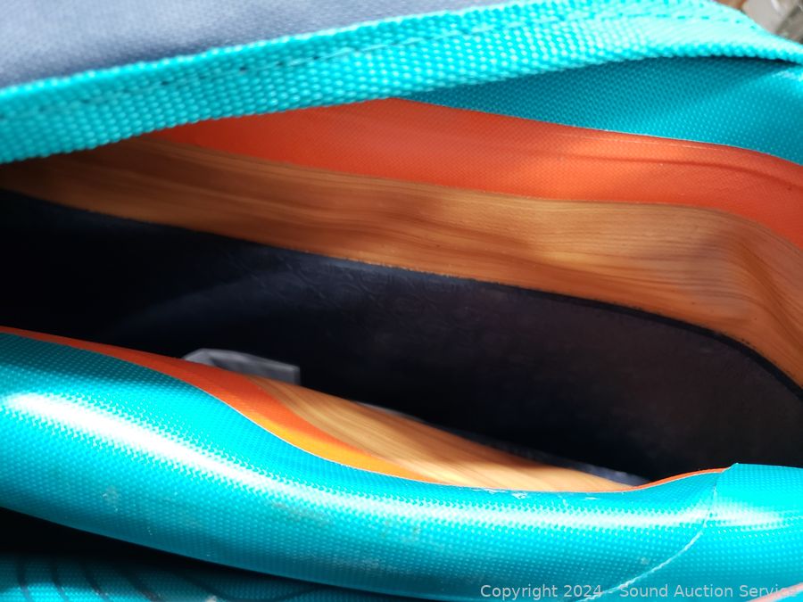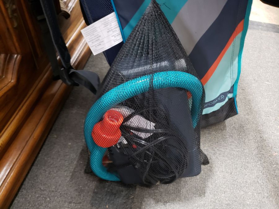 Comes with pump, fin, oar, straps, storage bag. Signs of wear from use, a bit dirty. Appears to be holding air.