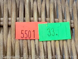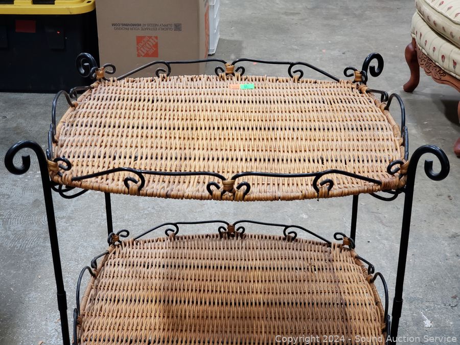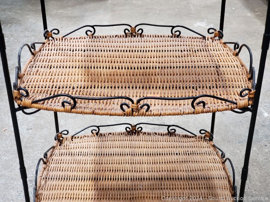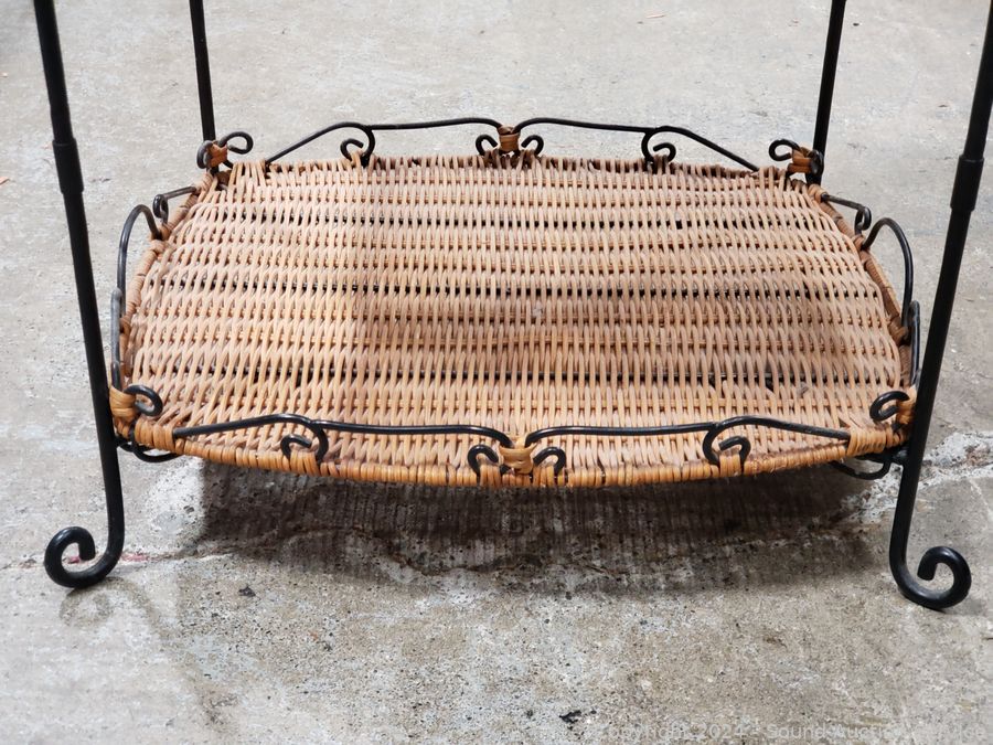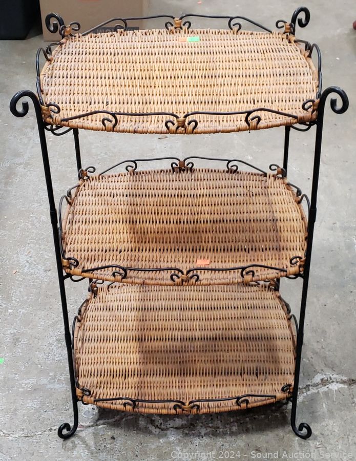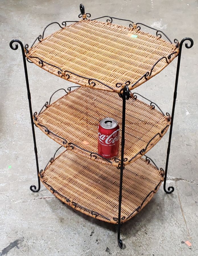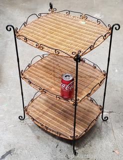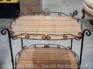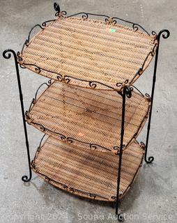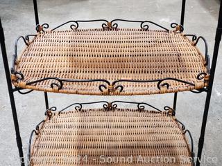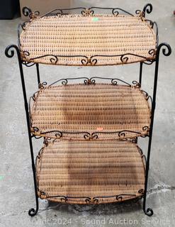 Lot #0033: Small Wrought Iron & Wicker 3-Tier Shelf
