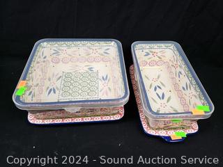 All comes with lids, 3 larger pieces comes with trivets, largest 9" x 13" pan comes with rack. Don't see any issues.