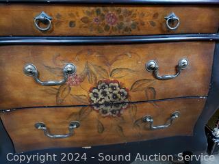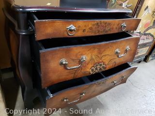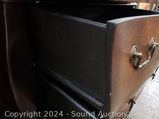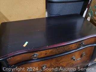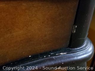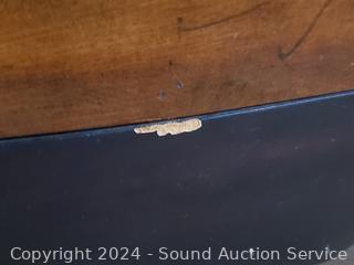Top drawer is velvet lined. Some scuffs, scratches, wear to finish. 25.5" H x 28" W x 14.5" D.