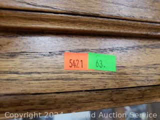 Appears to be solid wood construction, beveled glass. 74" H x 42" W x 11" D.