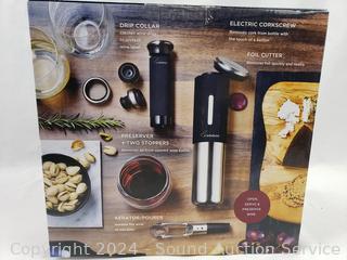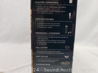 Elec. Corkscrew, Aerator/Pourer, Preserver & 2 Stoppers, Foil Cutter, Drip Collar, Charging Base. Appears to be functioning as intended, some items are still sealed.