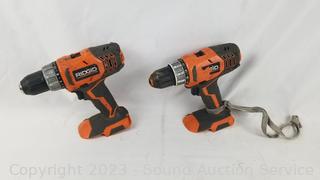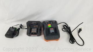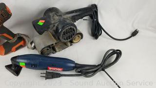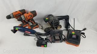 Lot Details: Parts/Repair, 2 cordless Ridgid drills come with 2 chargers but no batteries, untested. Ryobi detail sander is parts/repair - not functioning. Montgomery Ward 3" belt sander works, both chargers have power.