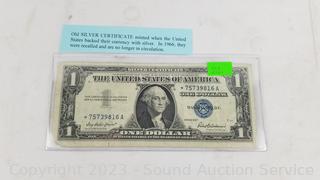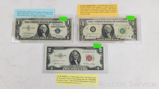 Lot Details: 1957 Old Blue Seal Silver Certificate, 1963B Scarce Barr Note, 1953 Red Seal $2 Note. ATTN: We are not coin or currency experts or graders, please use your own judgement when bidding.