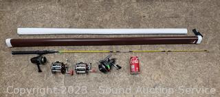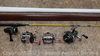 Lot Details: (2) Penn Peer No.209 reels, Electra reel, 5ft rod (missing tip), Fenwick hard case.