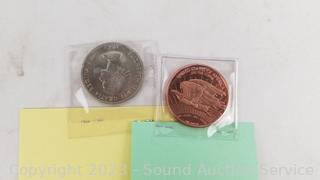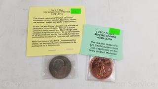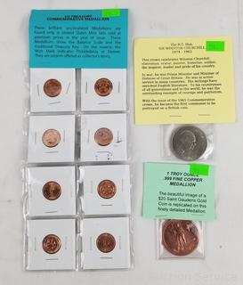 Lot Details: 8 US P & D Treasury Medallions, 1 Troy Ounce .999 Fine Copper Medallion, 1965 Sir Winston Churchill Medallion. ATTN: We are not coin or currency experts or graders, please use your own judgement when bidding.