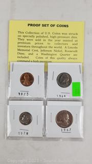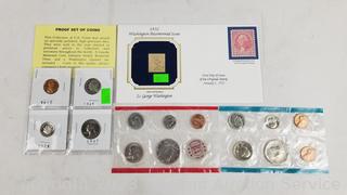 Lot Details: 1964-1978 Mixed Date Proof Set, 1972-U.C. Mint Set, FDI 2c George Washington 22ct Gold Replica Stamp. ATTN: We are not coin or currency experts or graders, please use your own judgement when bidding.