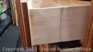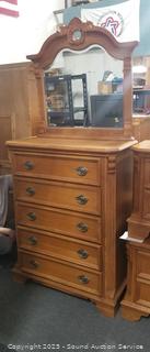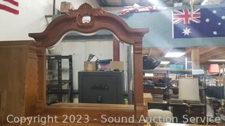Lot Details: IN great cosmetic condition, some minor scuffs, wear to finish. Solid wood construction, dovetail joinery. Matches the previous & next lots. 51" H x 40" W x 19.5" D with 37" H x 39" W beveled mirrored topper.