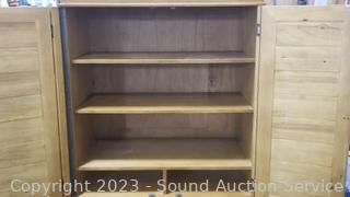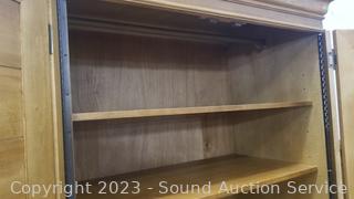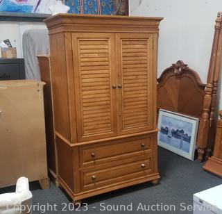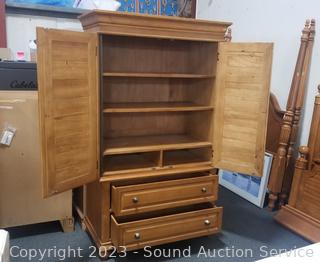 Lot Details: Set up with rod for hanging and shelves. Back is enclosed but removes for a TV. 2 Lower drawers. Appears to be solid wood construction, dovetail joinery. 78" H x 46" W x 25" D. Matches lot 9 & the previous few lots. Some scuffs, wear to finish, overall great condition.