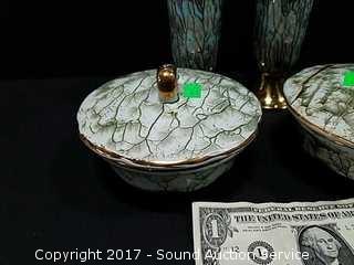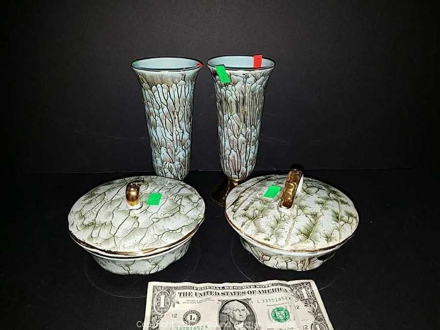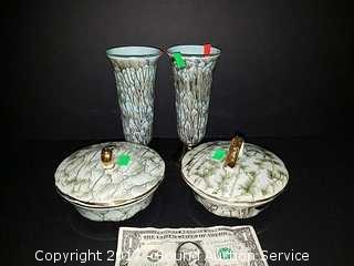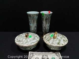 Made in Holland. 2 vases, 2 covered dishes.