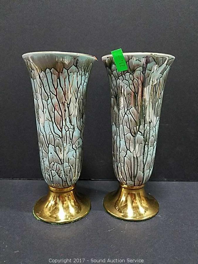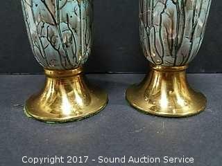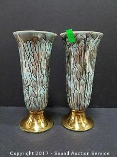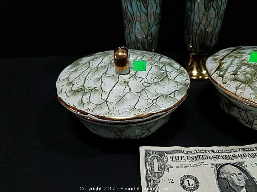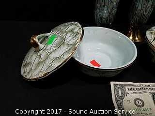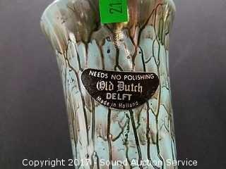 Lot #0021: Old Dutch Delft Gold Trim Vases & Covered Dish