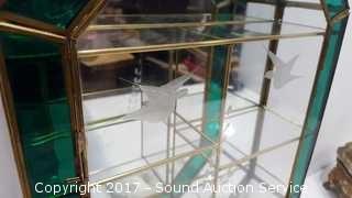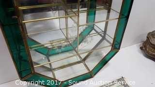 The wall display is brass and glass with a mirrored back and latching door. Approx. 14" tall, 10" wide and 2-3/4" deep.