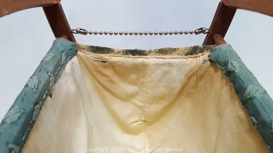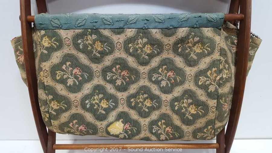 Hand stitched. Starting to fray. Some discoloration. Approx. 15" tall, 14" wide. Opens to 9" deep, 1" deep when closed.