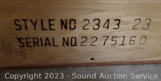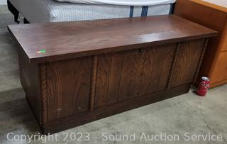 Lot Details: Locking, no key. Oak veneer finish, cedar lined. Serial 2275160. c.1972. 18" H x 45" W x 16". Some scuffs, wear to finish.