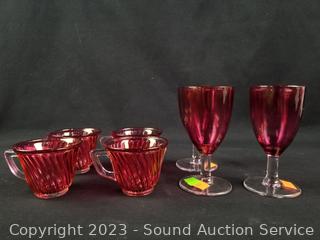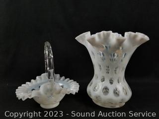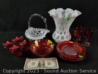 Lot Details: Opalescent handled basket, vase, cranberry cordials, vase, cups, saucers, dishes. Don't see any major issues.