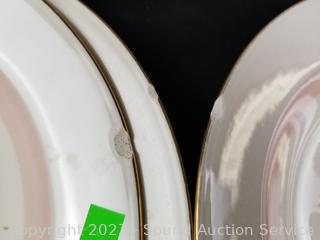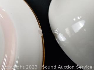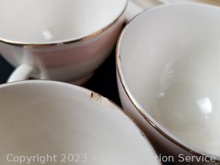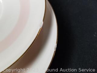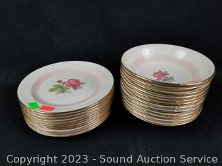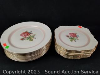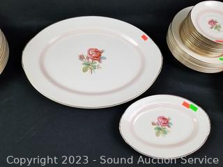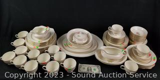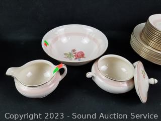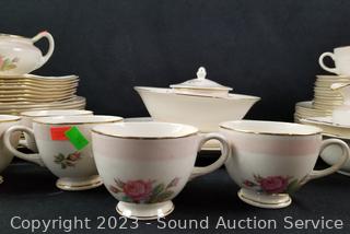 Lot Details: 13 pieces are chipped (3 cups, berry bowl, 2 saucers, snack plate, 3 bowls, 3 lunch plates), 12 cups, 14 saucers, 8 soup bowls, 9 square snack plates, 12 dinner plates, 11 berry bowls, 10 snack plates, 2 9" oval servers, gravy boat, cream, sugar, 8.5" round server, 9", 11.5" & 15.5" platters.