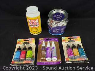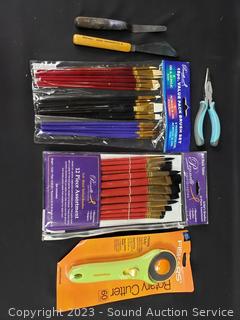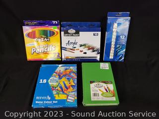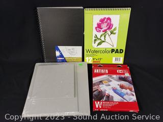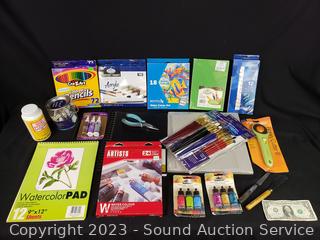 Lot Details: Cardboard Squares, Sketchbook, Rotary Cutter, Watercolor Set, Brush Packs, Colored Pencils, Acrylic Paints & More. Refer to photos for lot contents.