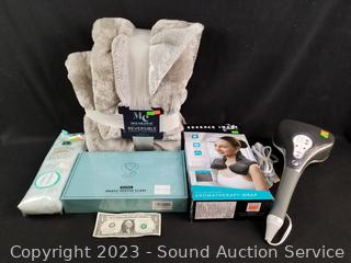 Lot Details: Scarf, wrap & blanket are sealed. Massager works.