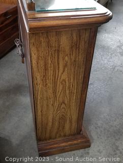 Lot Details: Single adjustable glass shelf. Wood fronts, particle board construction, veneer finish. 29" H x 28.5" W x 11.25" D.