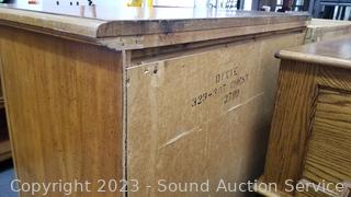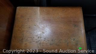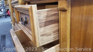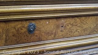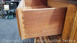 Wood fronts, veneer finish, dovetail joinery. Various scuffs, scratches, wear to finish. 49.5" H x 38" W x 19" D dresser, 24" H x 26" W x 17" D nightstand.