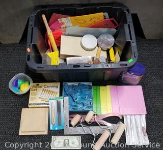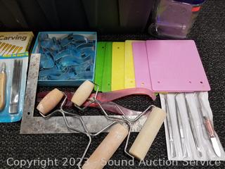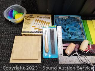 Wood carving tools, stencils, cookie cutter & more. Refer to photos for lot contents.