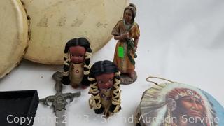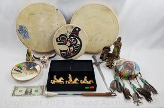 Lot #0064: Assorted Native Figures, Decor, 4 Drums