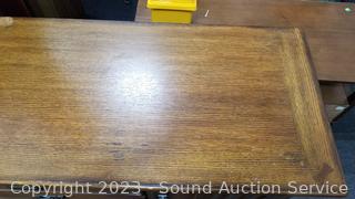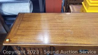 Some scuffs, wear to finish. Matches the previous lot. Appears to be solid wood construction, dovetail joinery. 40" H x 58" W x 18" D.