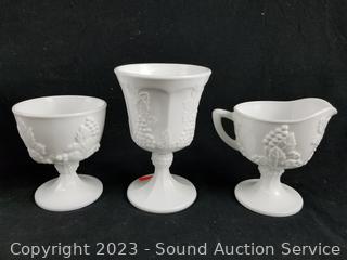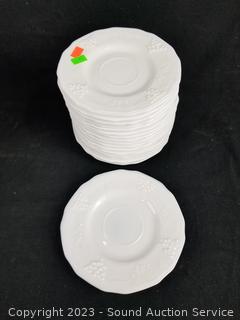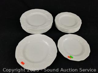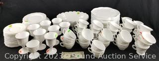 15 luncheon plates, 18 footed cups, 14 teacups, 2 creamers, 1 sugar, 8 goblets, 12" oval serving bowls, 18 saucers, 8 snack plates, 8 dinner plates. Don't see any major issues.
