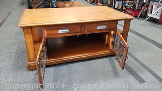 Some minor scuffs, wear to finish. 20" H x 48" x 28". On casters for easier movement. Made in USA. Appears to be solid wood construction.