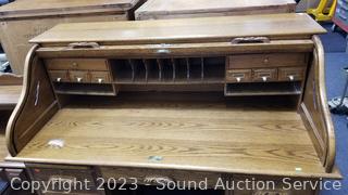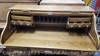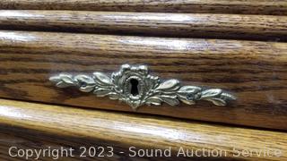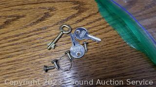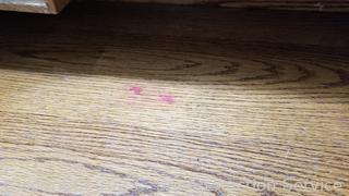 Locking, with keys. Some scuffs, scratches on the side, red stain on the top, don't see any other issues. 46" H x 54" W x 29" D.