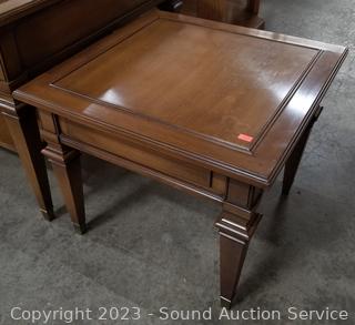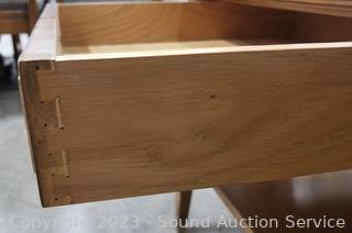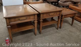 Lot Details: 2 Single drawer 2-tier tables, 21" H x 22" W x 28" D. Other 16" H x 19" x 19". Appear to be solid wood construction, dovetail joinery.