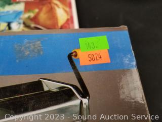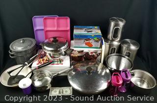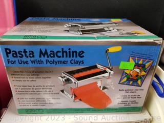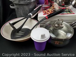 Pots, pans, utensils, cookbooks, pasta machine. Refer to photos for lot contents.