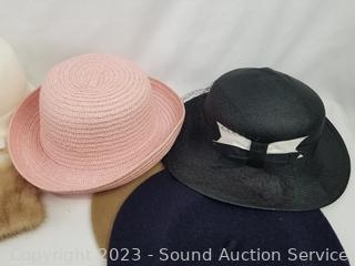8 Wool, Felt, Paper ladies hats, 2 genuine fur collars, 11.5" x 14" ladies purses.