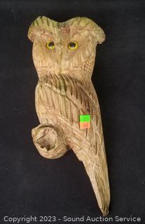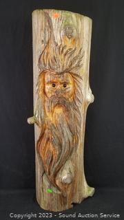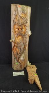 Lot #0282: Carved Wood Owl & Old Man Face Log Sculpture