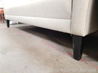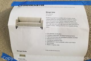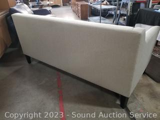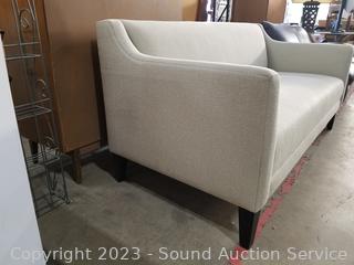 In excellent condition. Sku 296300. Consignor had a print out of this item listed on Crate & Barrel for $1,099 in 2/8/2015. Kiln dried hardwood frame, stained hardwood legs, rayon-polyester-cotton beige upholstery. 32" H x 70" W x 33" D x 17" to seat.
